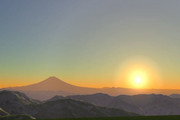 朝焼けの色をうまく出すのに、「霧」を使っています。「霧」をオレンジにして、視程を600kmくらいに淡くかけます。