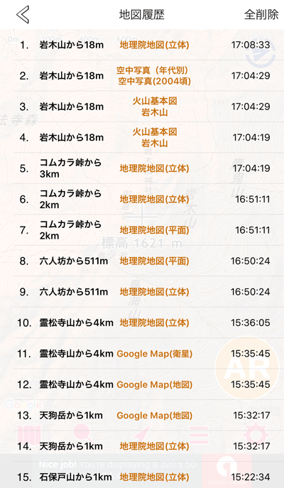 前に表示していた地図や、場所に戻りたいときにリストをタップすれば戻ることができます。