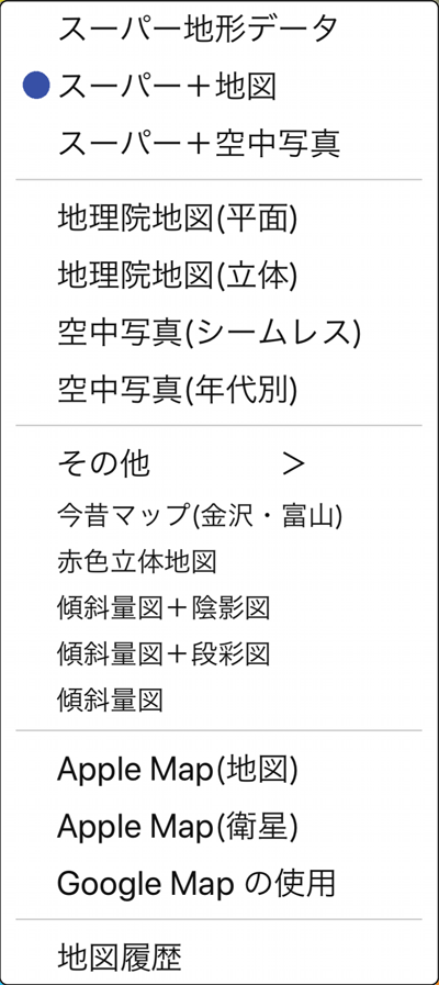 背景がスーパー地形データによる地形表示になりますので、地形を感じつつ、地図の実用性が必要なときに便利です。